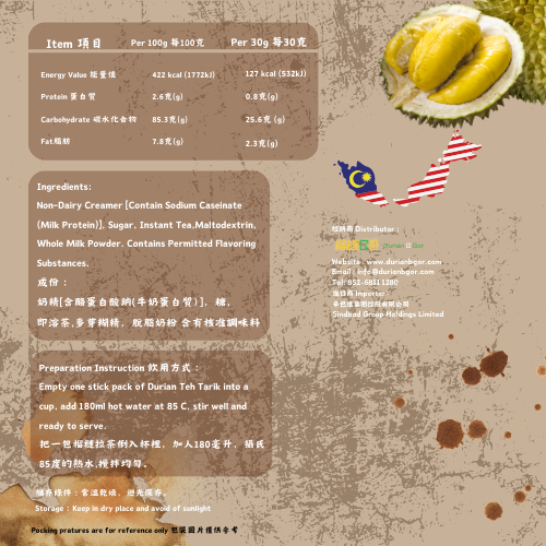 配料:奶精,糖,即溶茶,麥芽糊精,脫脂奶粉 榴蓮粉
